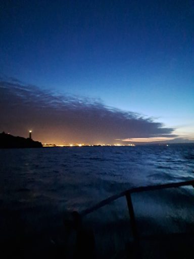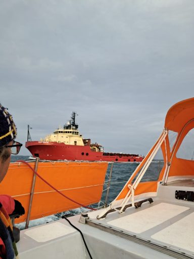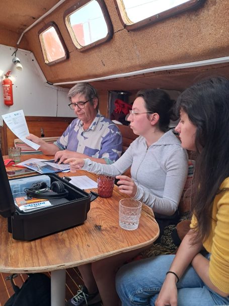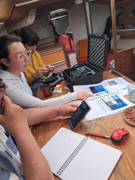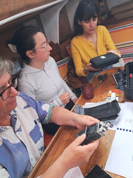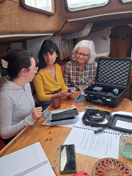 Salomé et Florence, salariées de Astrolabe Expéditions, sont venus à bord pour nous former à l'observation et à l'écoute des cétacés. Elles nous remettent un hydrophone et un enregistreur. Astrolabe Expéditions a cette idée géniale d'équiper les voiliers de capteurs pour fournir aux chercheurs des données sur les mers et les océans. Nous participons au programme Ketos en Manche car les chercheurs de l'ENSTA de Brest manque de données sur la Manche. C'est de la science participative.