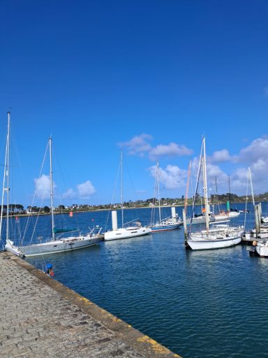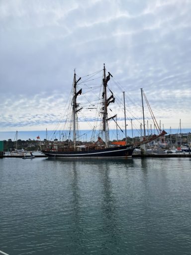 Il fallait partir à 6h00 du matin avec 6°C au thermomètre pour profiter de la marée montante dans le Chenal du Four, notre second passage à niveau. Malgré le peu de vent et un courant modéré, on se fait secoué en passant entre les iles de mer d'Iroise, Molène et Ouessant et la côte. On y croise un remarqueur de haute mer qui se met en position pour veir au secours des cargos qui seraient en dificulté à l'arrivée de la dépression. Al'arrivée, nous sommes accueillis par le bric "The Eye of the Wind" et nous nous amarrons derrière de grands voyageurs.
