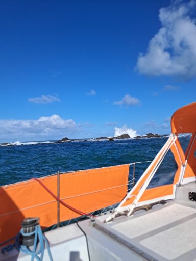 La houle s'est calmée. Le vent est faible. Allez on tente la sortie vers le nord est par le Chenal de la Malouine entre les rochers sur lesquelles explose la houle d'ouest. Frissons garantis/